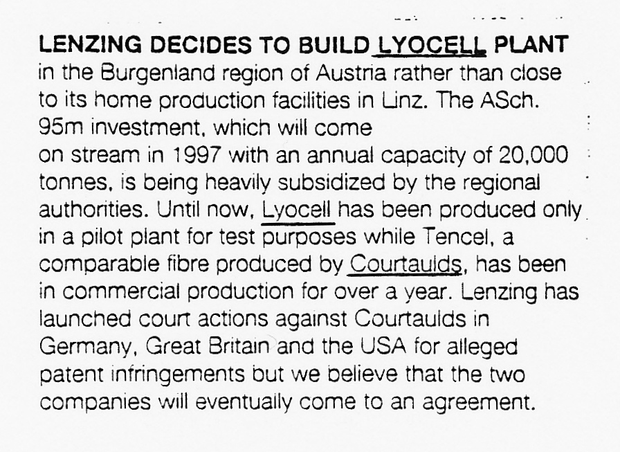 This small piece in Knitting International June 1995 was the first cutting with hard news of the Lenzing decision on scaling up their lyocell process. Courtaulds Tencel had been in commercial production since 1990 in the UK and 1992 in the USA, not since '94 as suggested here.
